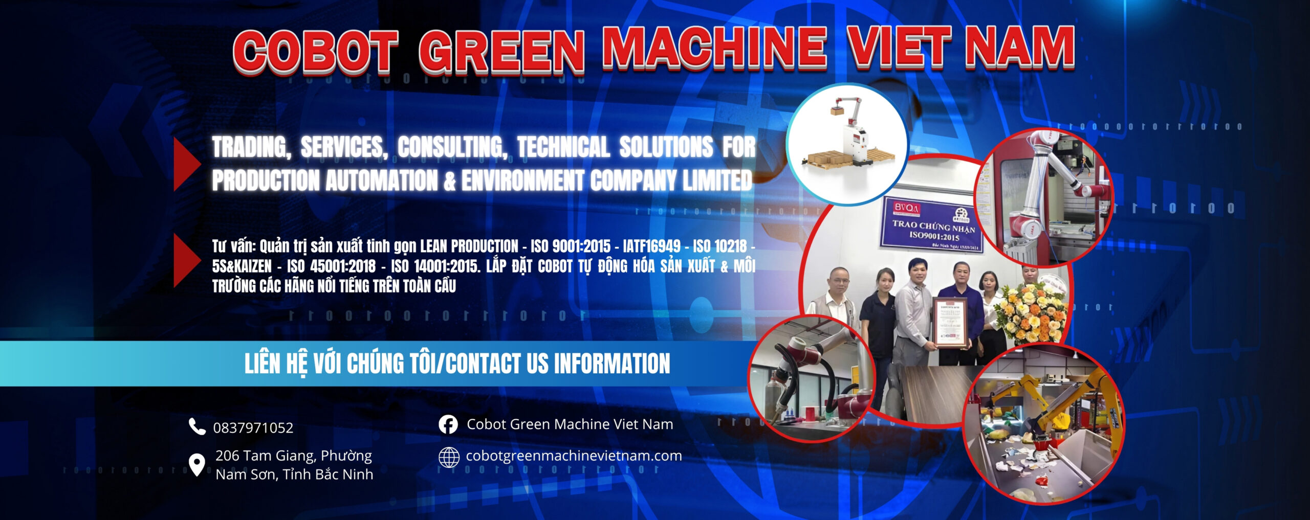 Cobot Green Machine mang đến các giải pháp robot cộng tác (Cobot) giúp doanh nghiệp tối ưu quy trình sản xuất, nâng cao hiệu suất vận hành và đảm bảo chất lượng ổn định trong môi trường nhà máy hiện đại.
